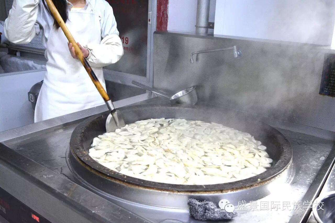 煮饺子了啦!厨师把同学们包的饺子逐个放进了沸腾的水中。